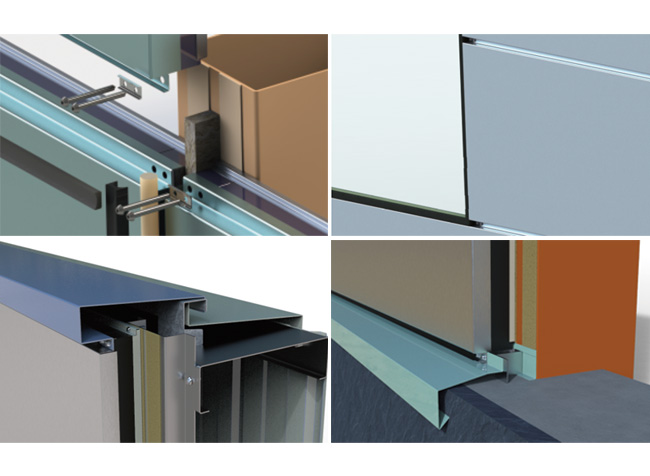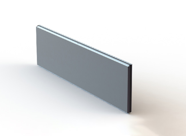 為復(fù)合型裝飾板塊,內(nèi)外層均為金屬板裝飾面,內(nèi)襯防火巖棉,采用雙組份膠粘合后加壓成型,具有較強(qiáng)的整體性。